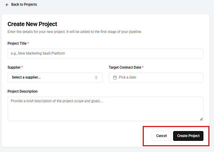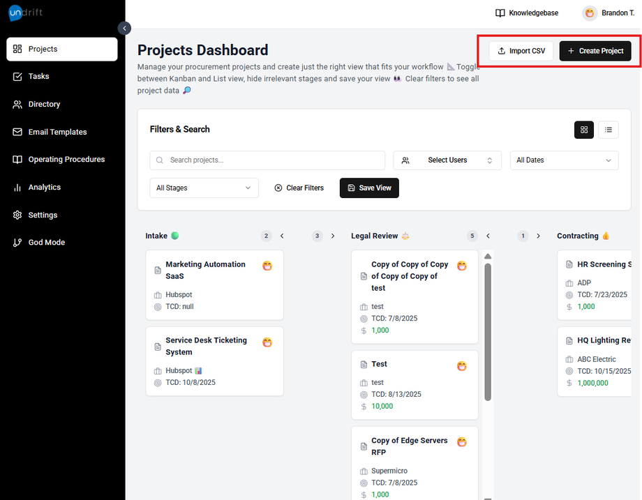 Projects are created from you Projects Dashboard where you can view, edit, and bulk import new projects. Create your first project:
