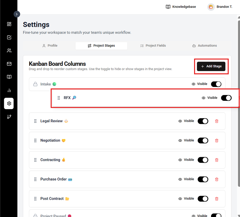 Create new stages, or drag and drop to or re-order them. Add as many stages in between "Intakeπ’ and Project Finalized π" as necessary so you can automate at every stage of your procurement process.