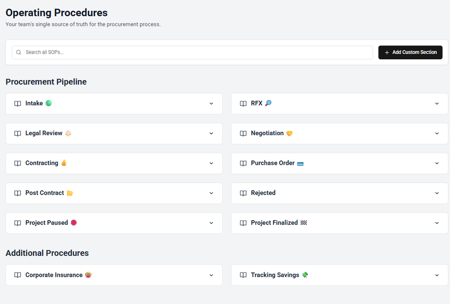 Operating Procedures are like your own personal (or Team for multi-tenant accounts) knowledgebase to store anything and everything related to your procurement process.