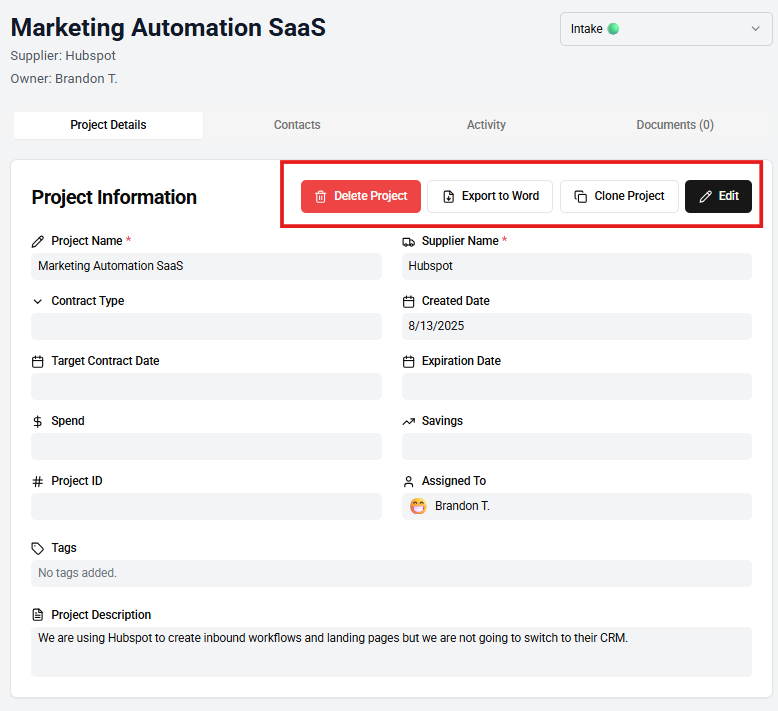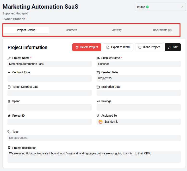 Project Cards store all of your pertinent procurement project details. There are some standard fields useful for reporting and analytics, but you can also create any type of field to ensure you capture the proper information on each project: